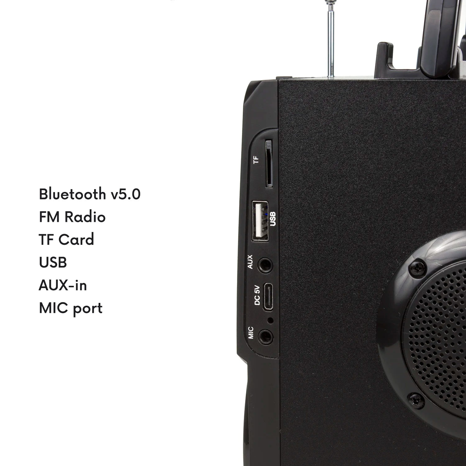 Functions:Bluetooth, AUX, USB, SD/MMC/TF, FM radio, EQ equalizer, remote control, microphone