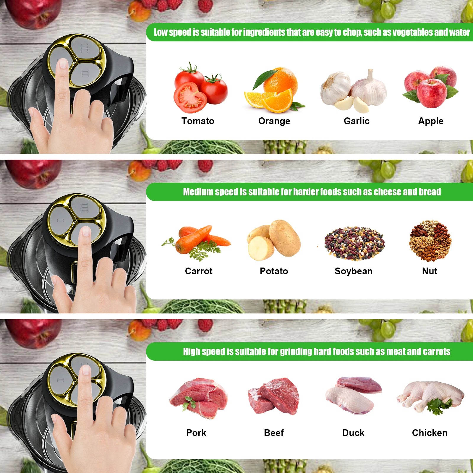 Low Speed - Suitable for easy-headed applicants: vegetables, fruits, garlic, nuts.