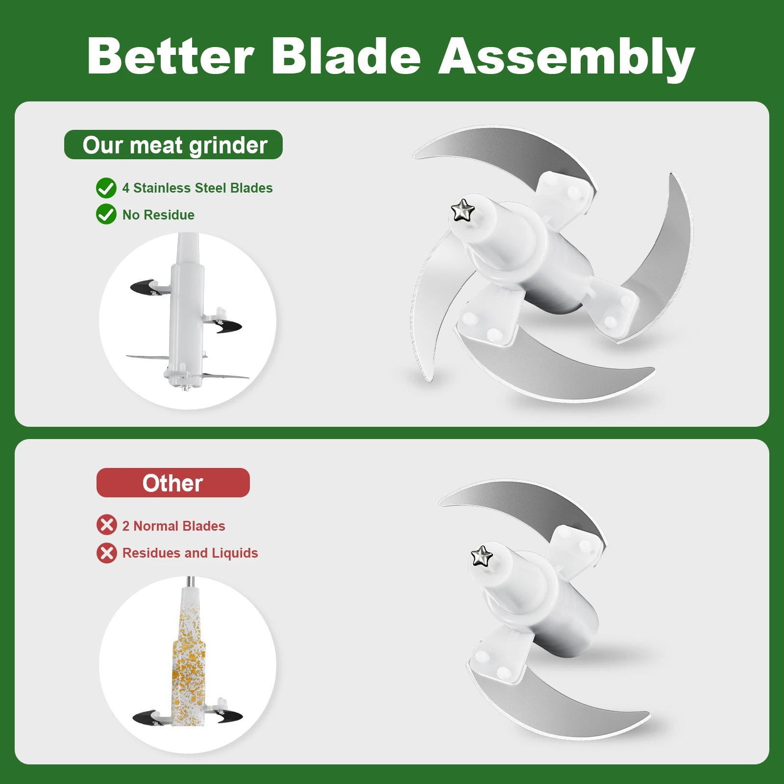 Double-Layer 4-blade S-shaped design with scientific cutting angle improves efficiency by 40%.