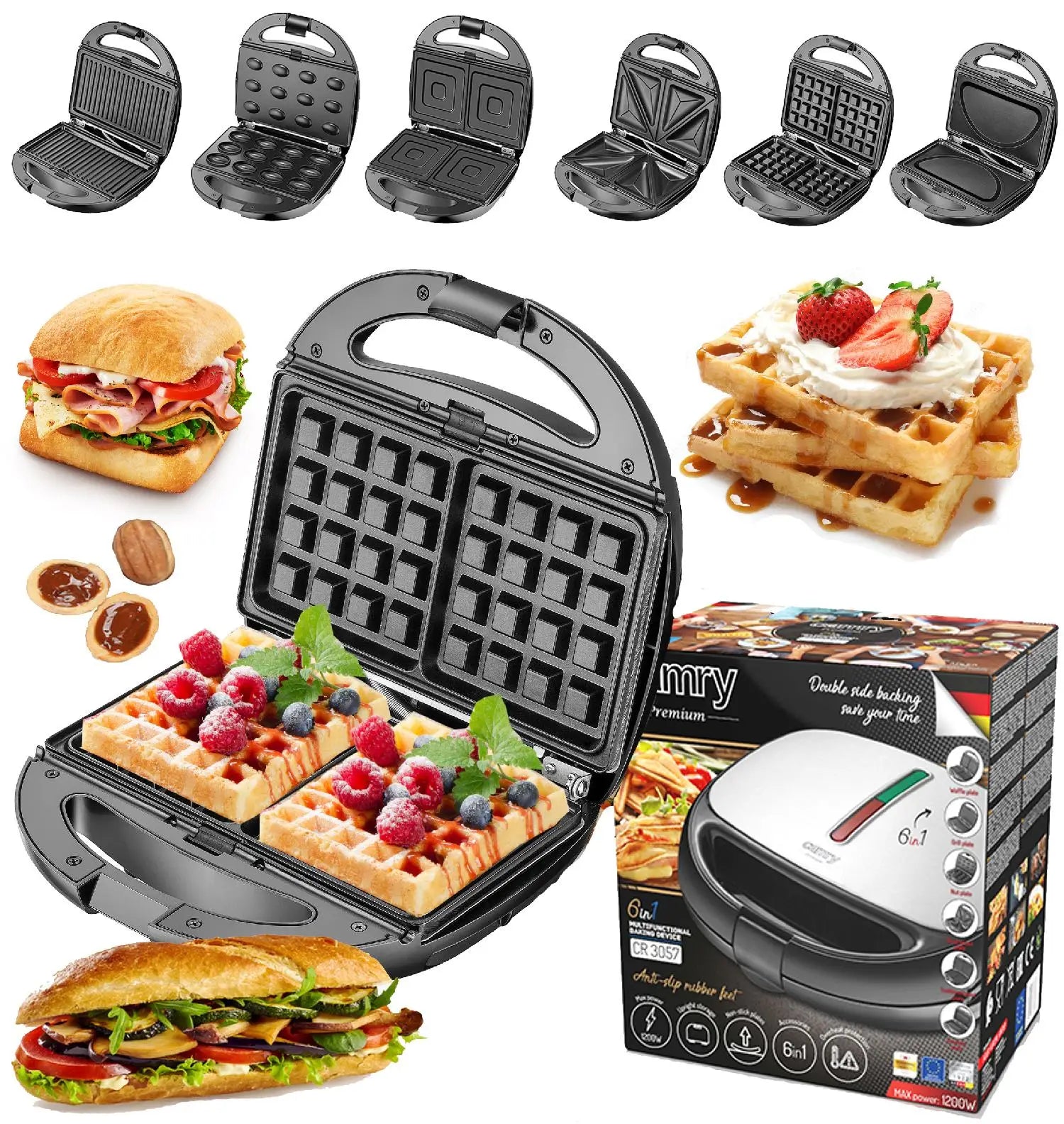 6in 1 Sandwich Toaster, 1200W Non-Stick Tiles, Safe Handle, Multifunctional, Silver/Grey.